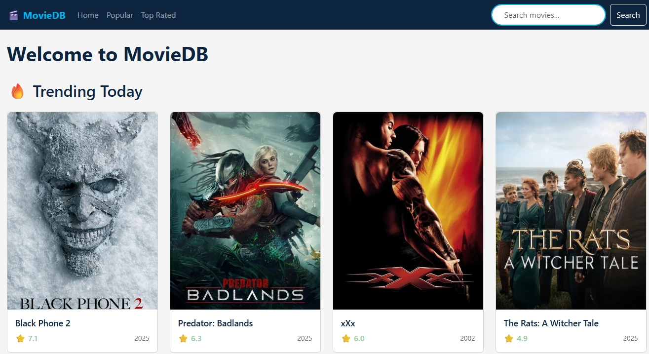 A modern, responsive movie database application with search functionality, trending movies, popular movies, top rated films, and detailed movie information. Built with React and TMDB API.
